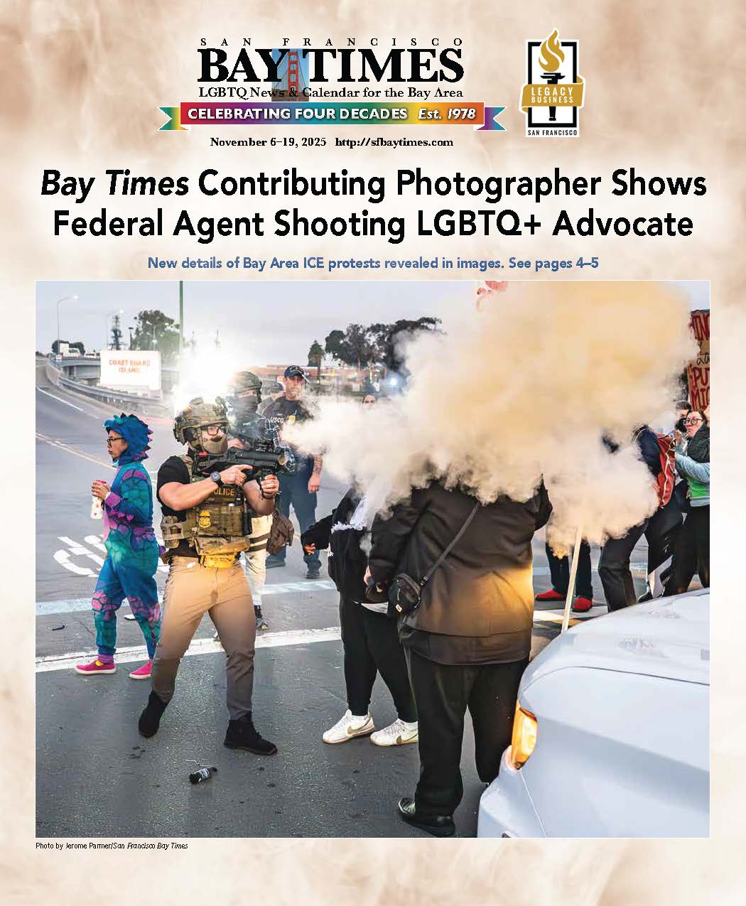 San Francisco Bay Times contributing photographer Jerry Parmer captured an unforgettable image while covering an Immigration and Customs Enforcement (ICE) protest outside a military base last October in Oakland, Calif. A pastor named Jorge Bautista was shot in the face with a projectile fired by an ICE officer.